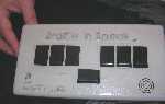 Adolfo nos mostró un pequeño anotador y una caja con 7 teclas que funciona como una especie de computadora, donde se almacenan datos ingresados mediante golpeteos en las teclas, y que de acuerdo a la cantidad de los mismos, se interpretan como cada letra del alfabeto. Los datos almacenados, luego son transmitidos en forma sonora, mediante un parlante que tiene incorporado o en forma de datos, a través de un cable conectado a una computadora.