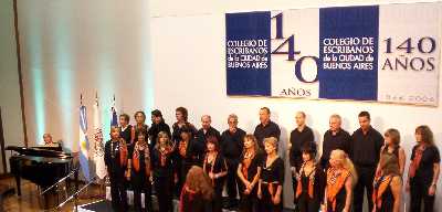 Comenzó la ronda el rabino Bergman quien entre otras cosas dijo: "La energía de lo espiritual abre caminos", también destacó que Moisés fue escriba. A su turno el pastor Tschirsch expresó "hay tres tipos de personas: los que ven como suceden las cosas, los que no se enteran de lo que sucede y los que hacen que las cosas sucedan", luego agregó "en este mundo mientras el 50% se muere de hambre, el otro 50% está preocupado por bajar de peso". El profesor Abboud dijo "Argentina es un gran país, uno de los pocos del mundo donde se puede hacer esto de la interreligiosidad", e invitó a "celebrar la nobleza de esta profesión, que cada una de sus firmas reciba la recompensa de Dios". El sacerdote Gutiérrez, refiriéndose a los presentes, comenzó diciendo "Quisiera abrazarlos a todos en una sola palabra, amigos" posteriormente entre otras cosas manifestó "el trabajo y la oración son las alas que nos llevan a Dios", también "lo mejor que tenemos es la interrelación cultural, religiosa y racial, ésa es la verdadera globalización" y finalizó expresando "estoy herido porque muchos medios atacan sistemáticamente a la iglesia, lo digo como católico, no como sacerdote" La ceremonia contó con el aporte musical a cargo del Coro del Colegio de Escribanos (foto), que interpretó el Himno Nacional Argentino, acompañado al piano por el Escribano Horacio Gigli, y luego compartieron el escenario con el Coro del Country Club Los Lagartos, a cargo de Silvia Pérez y Luis María Serra respectivamente, los que interpretaron un repertorio que incluyó temas como Over the rainbow de Harold Arlen y Va Pensiero de Giusseppe Verdi. ![]() El 7 de abril se realizó una cena de celebración del 140º Aniversario. Reunidos en el Salón Pacífico del Hotel Hilton los invitados compartieron una velada de camaradería, animada por el grupo Rojo Tango, espectáculo musical, en donde quince artistas en escena realizaron un recorrido por la historia del tango desde la década del ´20 hasta Piazzolla. También se inauguró la muestra "Ante mí doy fe, Historia de la Escritura", compuesta por importantes documentos de la historia argentina, que se extenderá hasta el mes de Junio, en el subsuelo del Colegio de Escribanos de la Ciudad de Buenos Aires (Callao 1542).