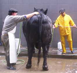 El back stage: el ordeñe de vacas, sobre todo las Holando Argentinas, que dan un promedio de 50 litros diarios, siendo ordeñadas cada 12 horas, el baño de los toros, el cepillado con espuma y el peinado de la cola.