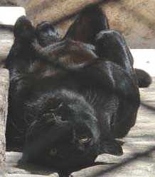 La pantera negra, desperezándose, observándonos de revés, con sus ojos amarillos que contrastan con su pelaje negro intenso, brilloso y un bellísimo ejemplar de puma, con su mirada alerta y su color suave y aterciopelado.