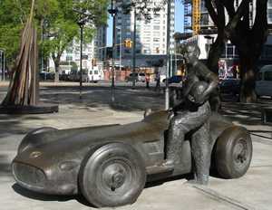 Este querido y recordado corredor automovilístico tiene su monumento en la calle Azucena Villaflor 435, del barrio de Puerto Madero, frente al edificio de Daimler Chrysler Argentina. Se trata de una escultura de bronce, del artista español Joaquin Ros Sabaté, que lo muestra junto al "Flecha de plata", un Mercedes-Benz W196, con cuyo equipo ganó los campeonatos de 1954 y 1955. El monumento, de 3,5 toneladas es el quinto que se levanta en el mundo en homenaje al ex piloto de Balcarce.